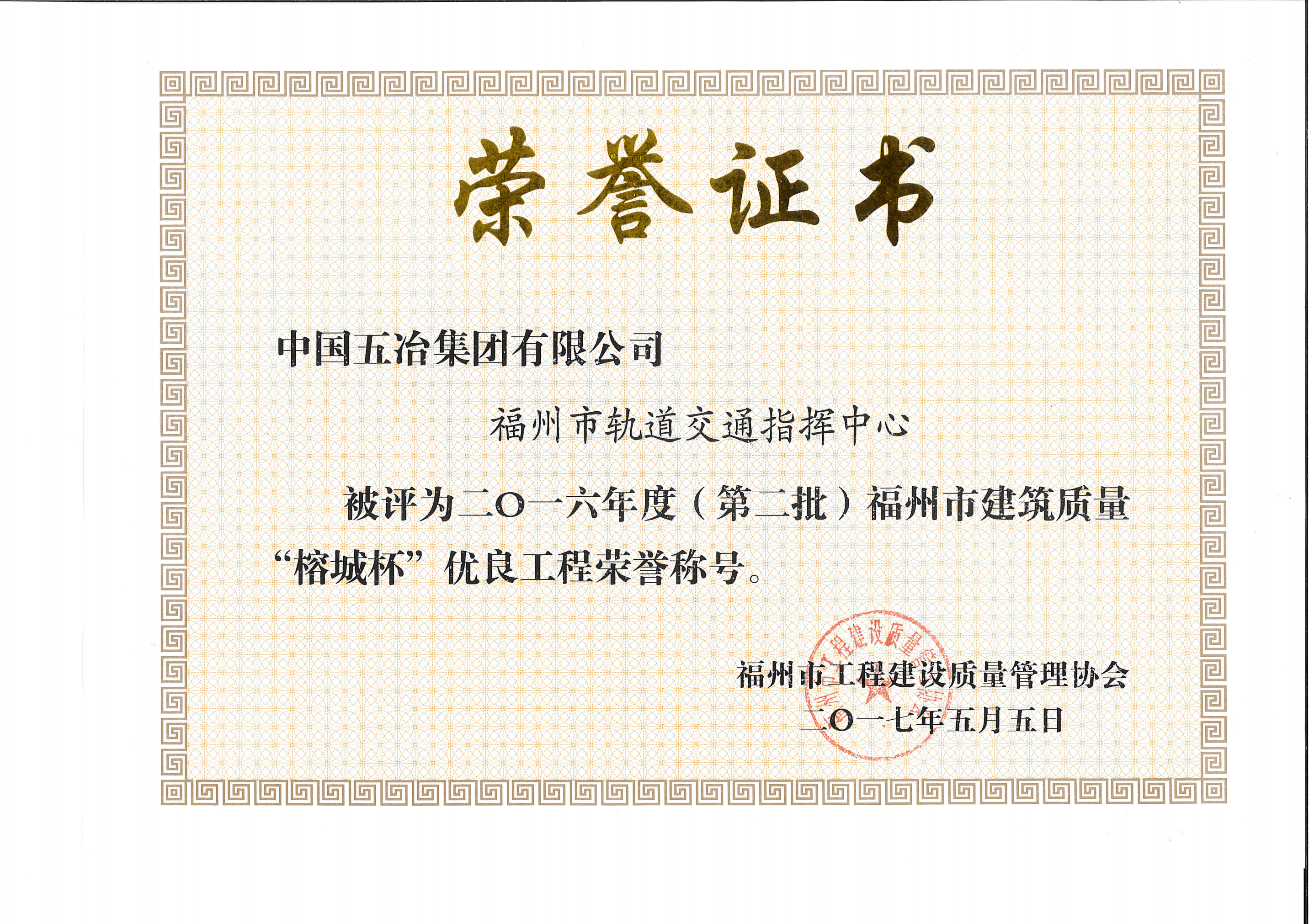 福州市轨道交通指挥中心被评为二O一六年度(第二批����� �������Ƴ������������ �������Ƴ������������ �������Ƴ������������ �������Ƴ�������)福州市建筑质量“榕城杯”优良工程荣誉称号
